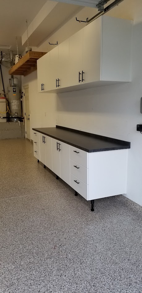 This project features custom white garage cabinets paired with an epoxy / polyaspartic floor coating in our popular Almond Blend—a clean, timeless look that instantly elevates the entire space.