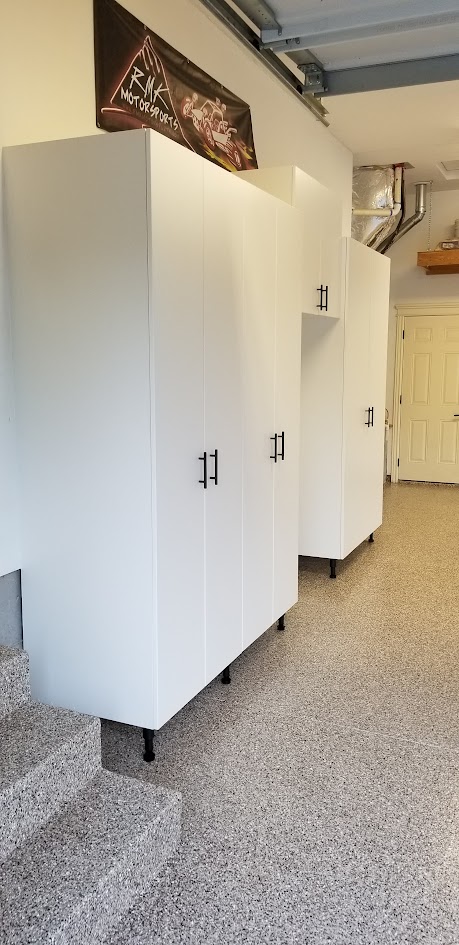 Wall-mounted cabinets keep tools, gear, and household items off the floor, making the garage easier to use, clean, and maintain.
