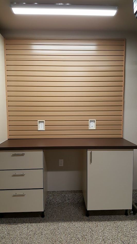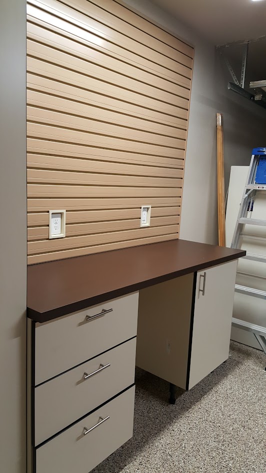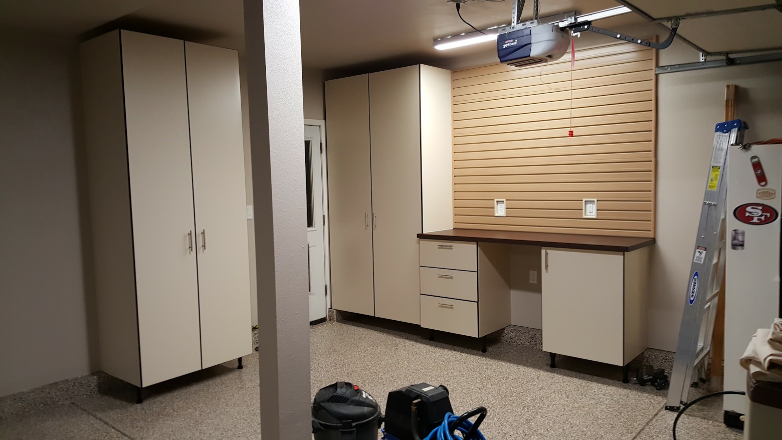 The combination of new cabinets, slatwall, and a seamless epoxy coating gives this garage a clean, modern, and highly functional finish. Everything is professionally measured, leveled, and installed for long-term durability.