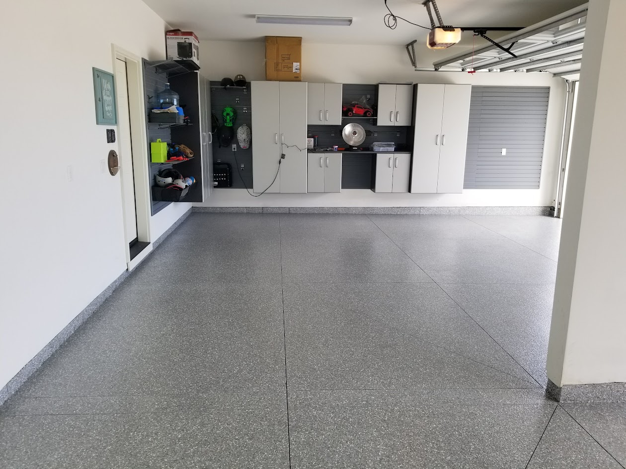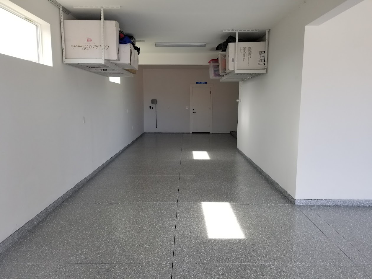 Epoxy + Polyaspartic Floor • Custom Cabinets • Overhead Storage • Slatwall