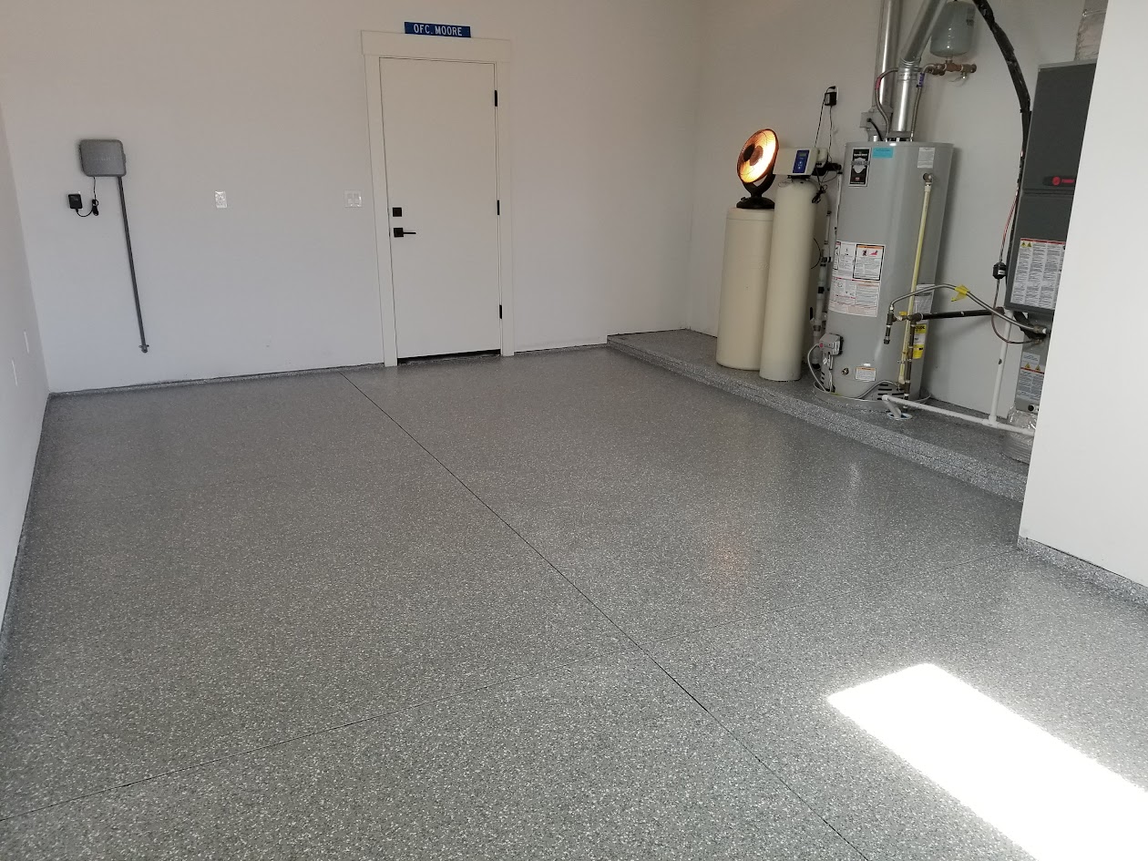 A professionally prepped concrete surface finished with a high-performance epoxy base and polyaspartic topcoat. This system delivers superior durability, moisture resistance, and a clean, modern grey finish that’s easy to maintain.