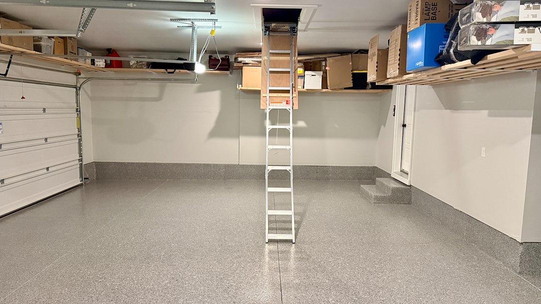 With the combination of a professional epoxy and polyaspartic floor coating, heavy-duty shelving, and accessible attic storage, this garage is now designed to maximize space while maintaining a clean and organized appearance.