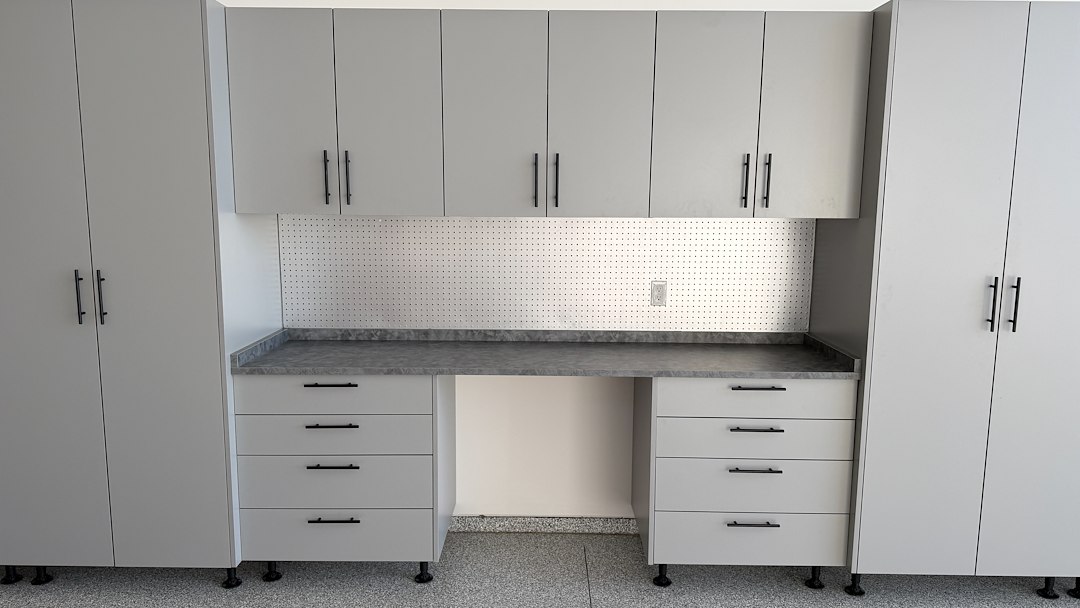 The matte fog grey cabinet finish combined with black hardware creates a modern aesthetic that complements the bright, open garage space.