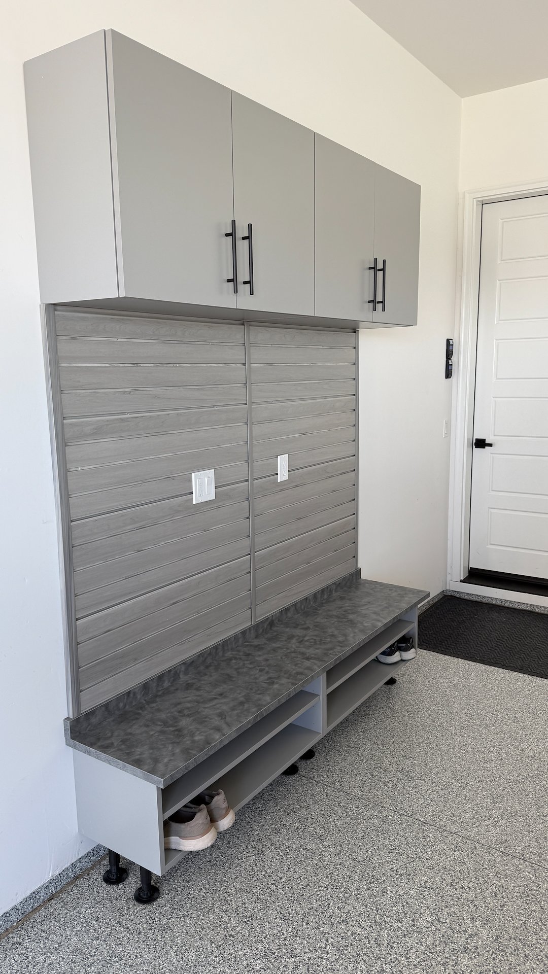 Near the garage entry door, we installed a custom shoe cubby and bench system paired with the weathered barnwood slatwall. This provides a convenient drop zone for shoes, coats, and daily essentials while keeping the garage clean and organized.