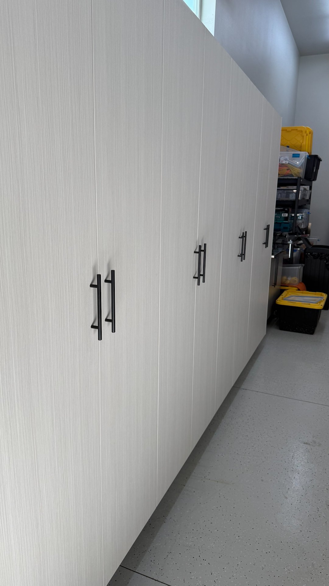 These cabinets were thoughtfully designed to meet the client’s specific storage needs while seamlessly complementing the wall colors and epoxy-coated floors. The cohesive design strikes a perfect balance between functionality and style, transforming the garage into a clean, organized, and visually appealing space.